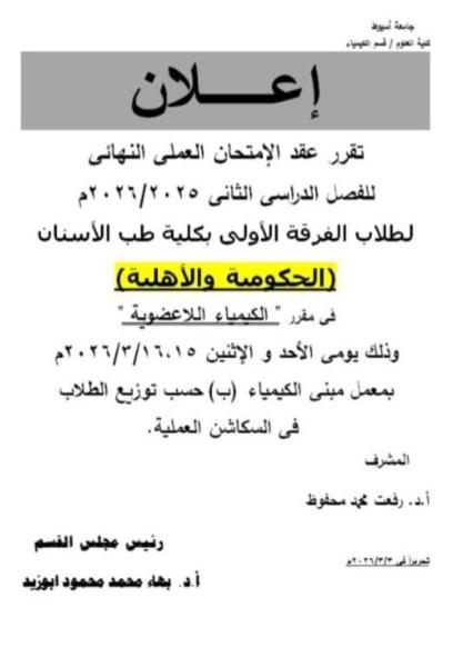 موعد عقد امتحان العملي لمادة الكيمياء اللاعضوية لطلاب الفرقة الأولى( حكومي ، أهلية ) .