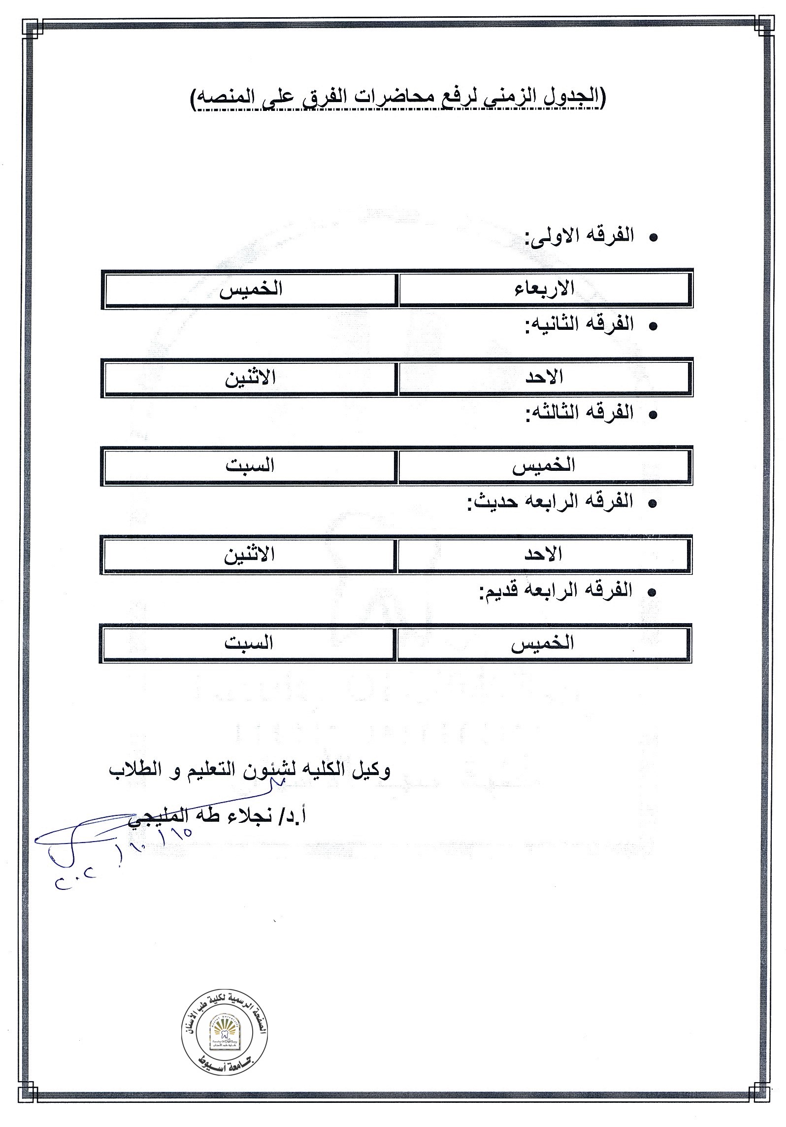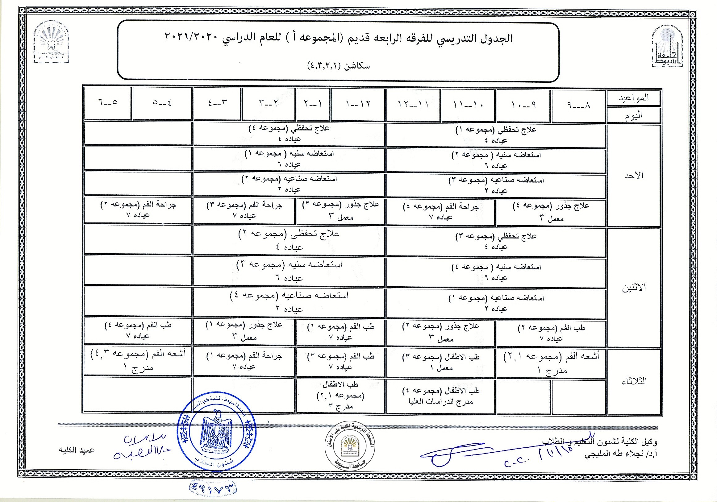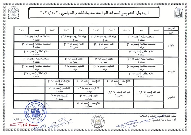 تعديل الجدول التدريسي للفرقة الرابعة (حديث) ، للعام الدراسي 2020/2021 .