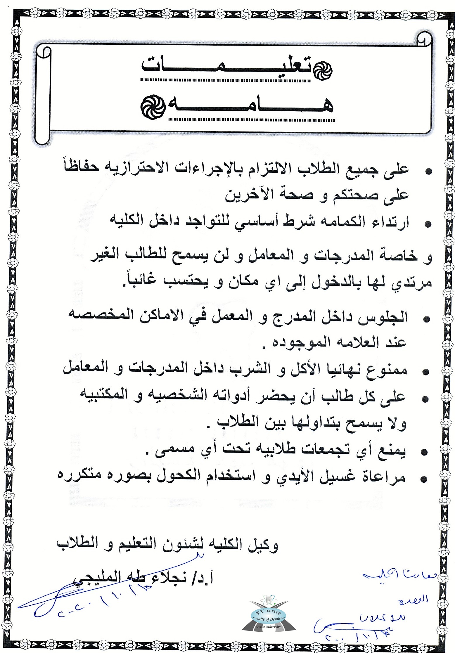 على جميع العاملين بكلية ومستشفى طب الاسنان الجامعي (أطباء-تمريض-صيانة-عمال-أمن-موظفين) التوجه يوم الاحد الموافق 11/10/2020 امام قاعات الدراسات العليا بالكلية وذلك للكشف عن الامراض المزمنة بواسطة فرق طبية للفحص الطبي تنفيذاً لمبادرة رئيس الجمهورية والحملة القومية 100 مليون صحة .