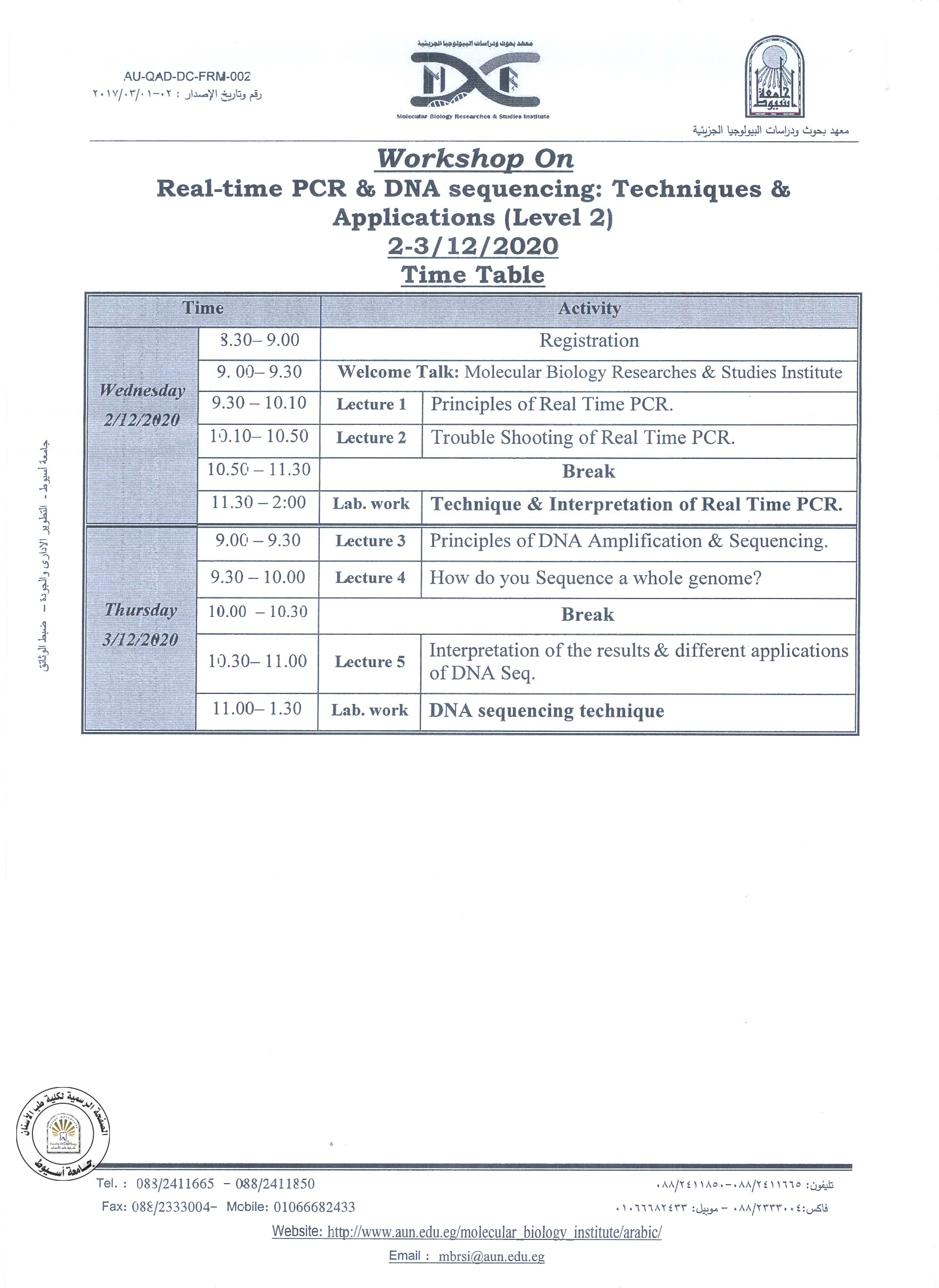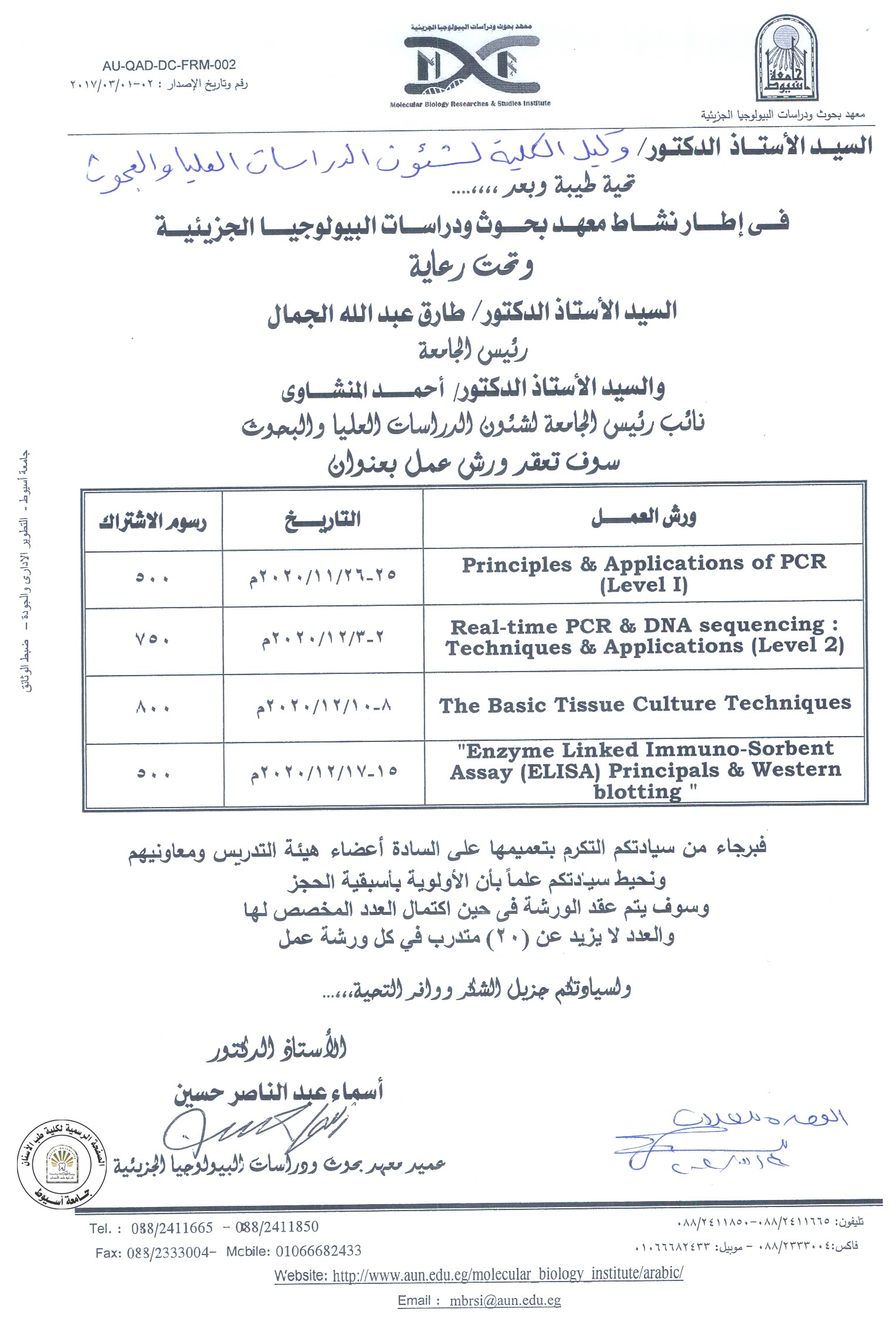 يعلن معهد بحوث و دراسات البيولوجيا الجزيئية عن عقد ورش عمل لـ السادة أعضاء هيئة التدريس و معاونيهم . مرفق عناوين ، الجداول ، و مواعيد الورش . Read more about يعلن معهد بحوث و دراسات البيولوجيا الجزيئية عن عقد ورش عمل لـ السادة أعضاء هيئة التدريس و معاونيهم . مرفق عناوين ، الجداول ، و مواعيد الورش . يعلن معهد بحوث و دراسات البيولوجيا الجزيئية عن عقد ورش عمل لـ السادة أعضاء هيئة التدريس و معاونيهم . مرفق عناوين ، الجداول ، و مواعيد الورش . 18 نوفمبر 2020