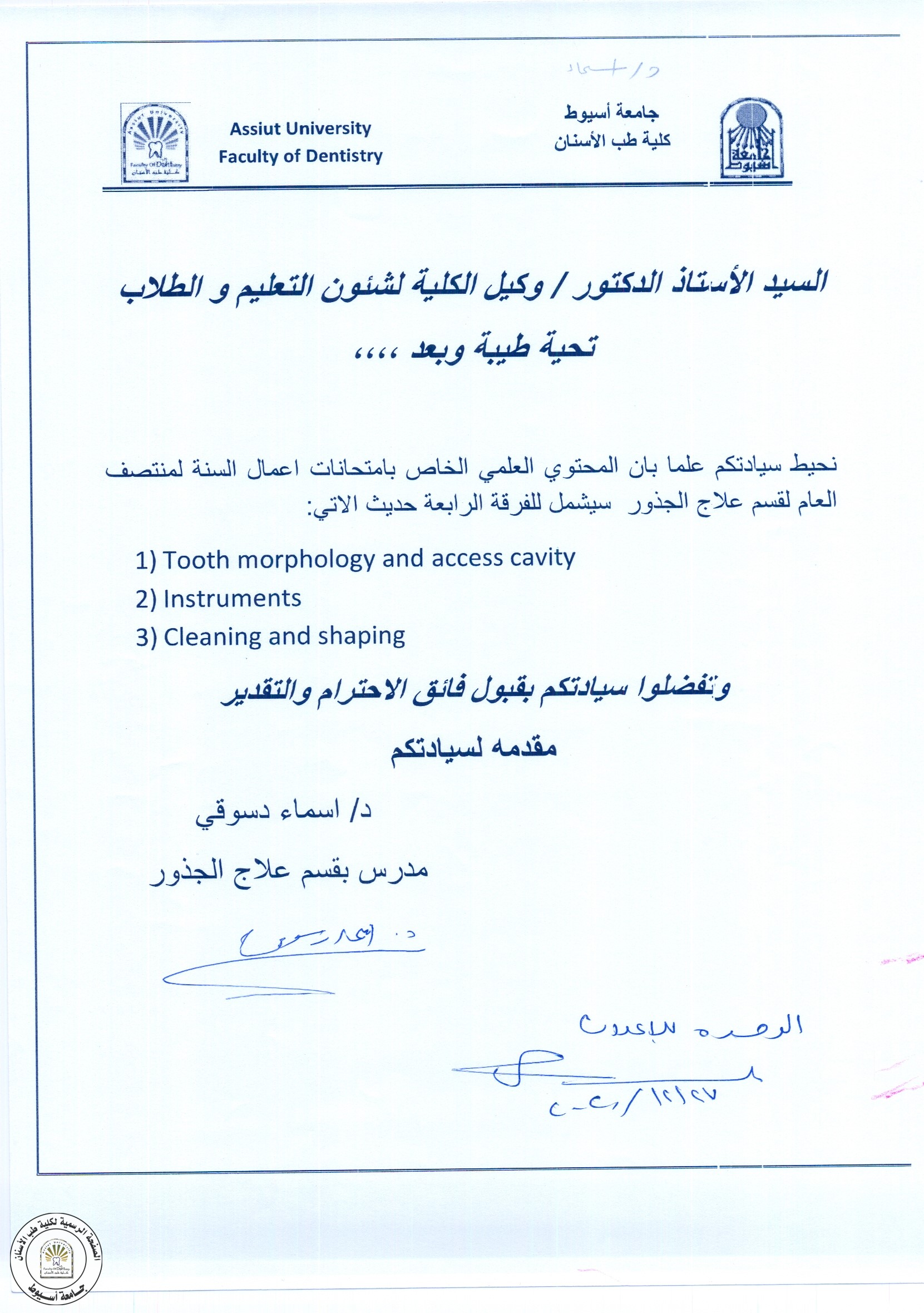 تحديد المحتوى العلمي الخاص بامتحانات اعمال السنة لقسم علاج الجذور للفرقة الرابعة حديث . Read more about تحديد المحتوى العلمي الخاص بامتحانات اعمال السنة لقسم علاج الجذور للفرقة الرابعة حديث . تحديد المحتوى العلمي الخاص بامتحانات اعمال السنة لقسم علاج الجذور للفرقة الرابعة حديث . 27 ديسمبر 2020