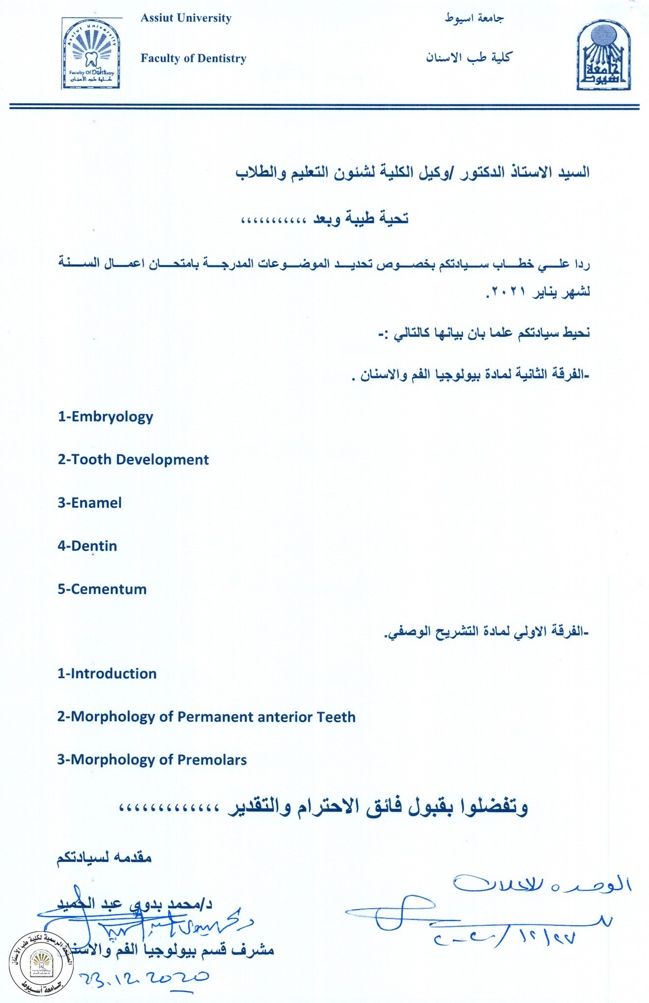 تحديد المحتوى العلمي الخاص بامتحانات اعمال السنة مادة بيولوجيا الفم و الاسنان ( الفرقة الثانية ) ، مادة التشريح الوصفي ( الفرقة الاولى ) . Read more about تحديد المحتوى العلمي الخاص بامتحانات اعمال السنة مادة بيولوجيا الفم و الاسنان ( الفرقة الثانية ) ، مادة التشريح الوصفي ( الفرقة الاولى ) . تحديد المحتوى العلمي الخاص بامتحانات اعمال السنة مادة بيولوجيا الفم و الاسنان ( الفرقة الثانية ) ، مادة التشريح الوصفي ( الفرقة الاولى ) . 27 ديسمبر 2020