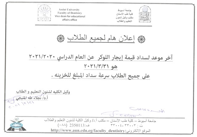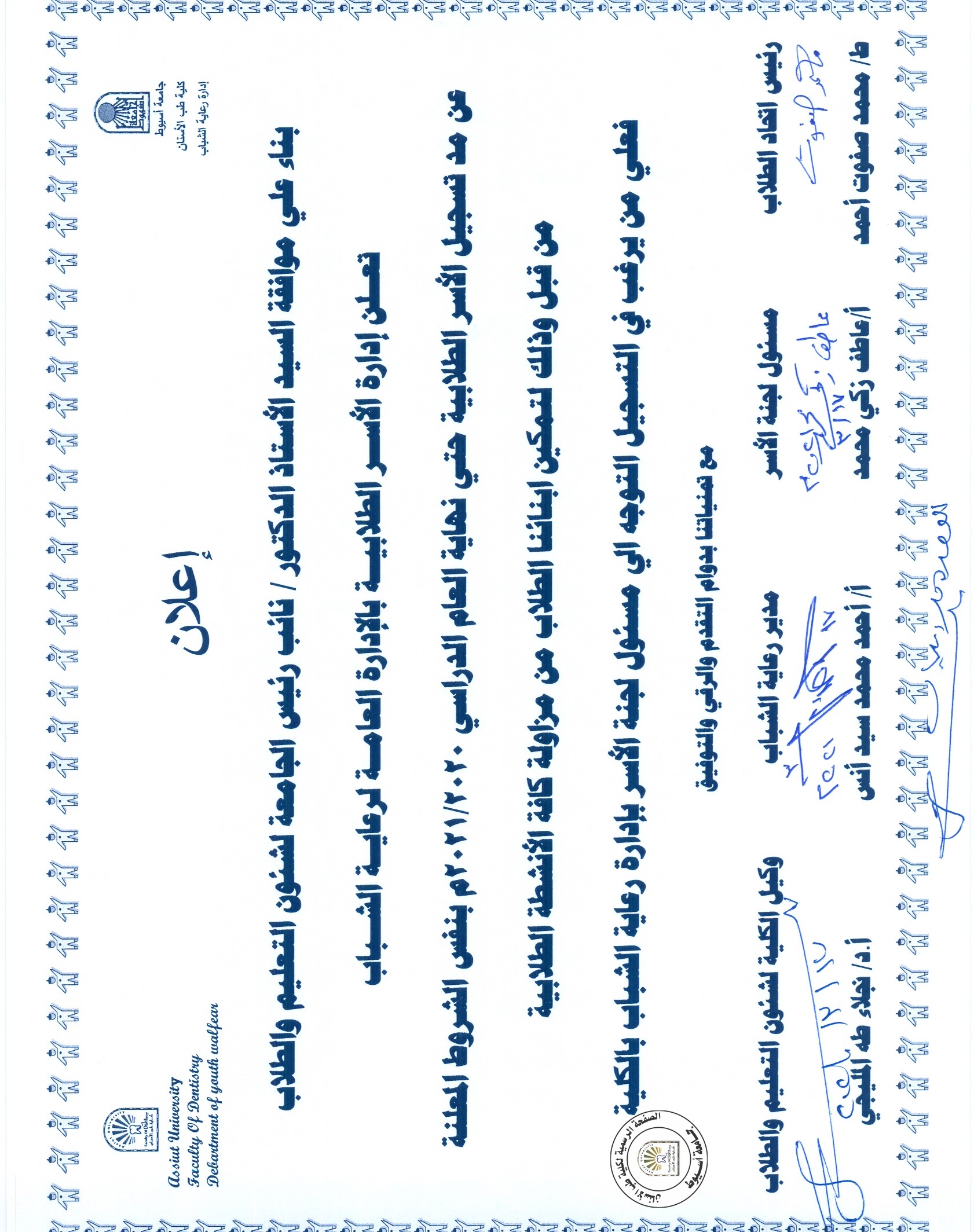 تعلن رعاية الشباب عن مد تسجيل الأسر الطلابية حتى نهاية العام الدراسي 2020/2021 بنفس الشروط المعلنة من قبل و ذلك لتمكين ابنائنا الطلاب من مزاولة كافة الأنشطة الطلابية .