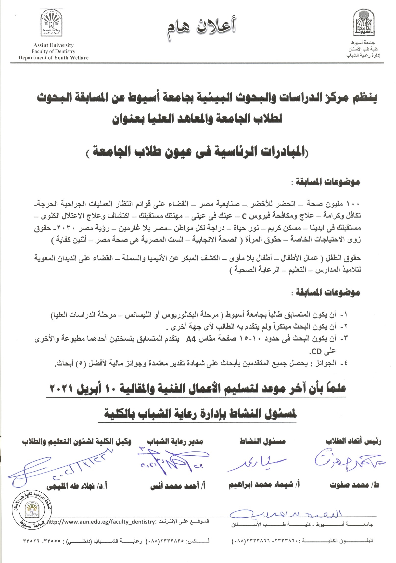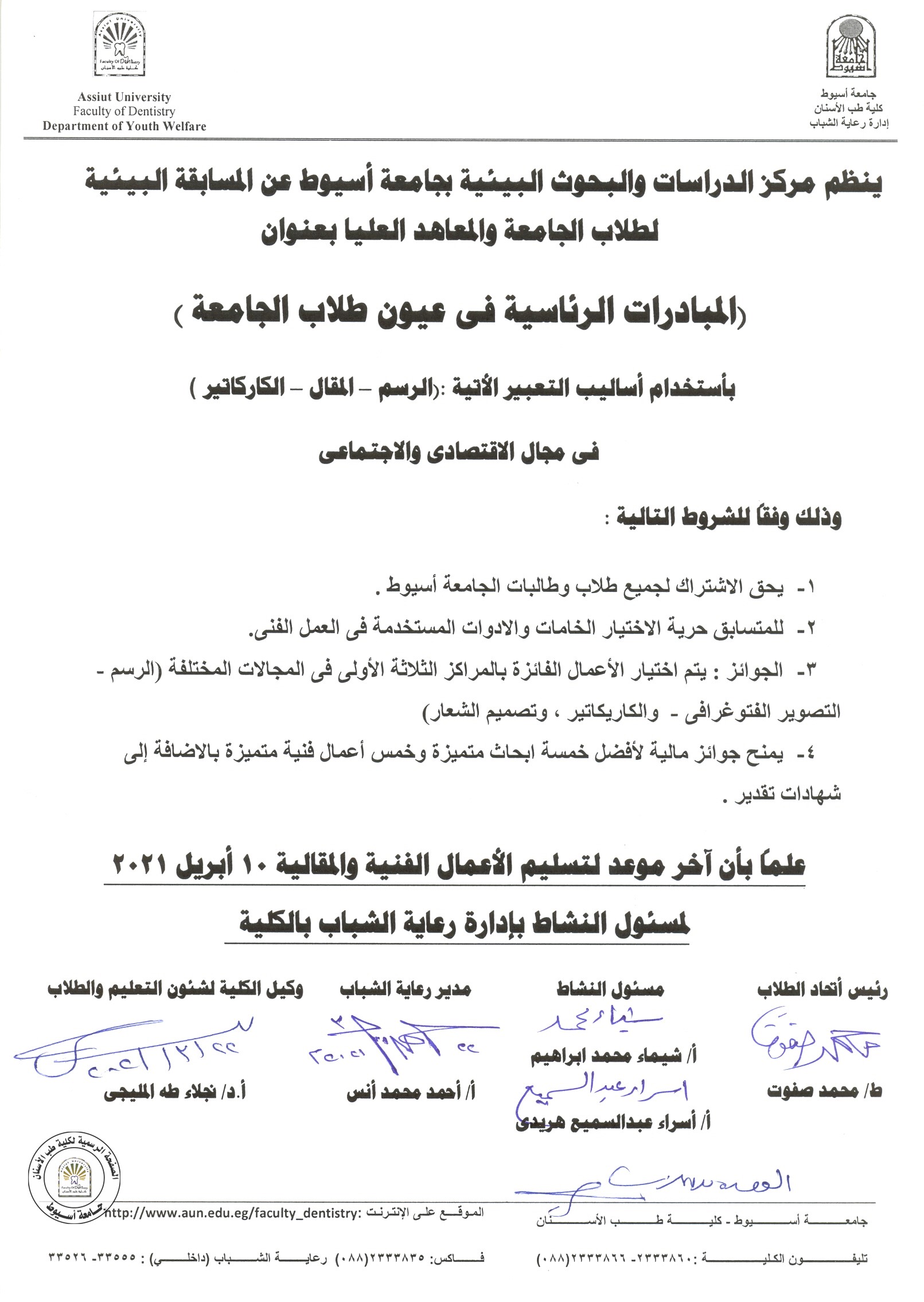 ينظم مركز الدراسات و البحوث البيئية بجامعة اسيوط عن المسابقة البيئية لطلاب الجامعة و المعاهد العليا بعنوان ( المبادرات الرئاسية في عيون طلاب الجامعة ) بأستخدام أساليب التعبير الأتية : ( الرسم ، المقال ، الكاركاتير ) في مجال الاقتصادي و الاجتماعي .