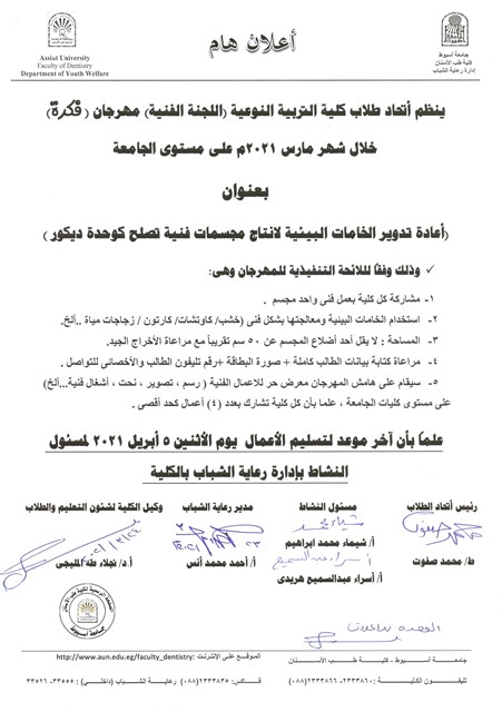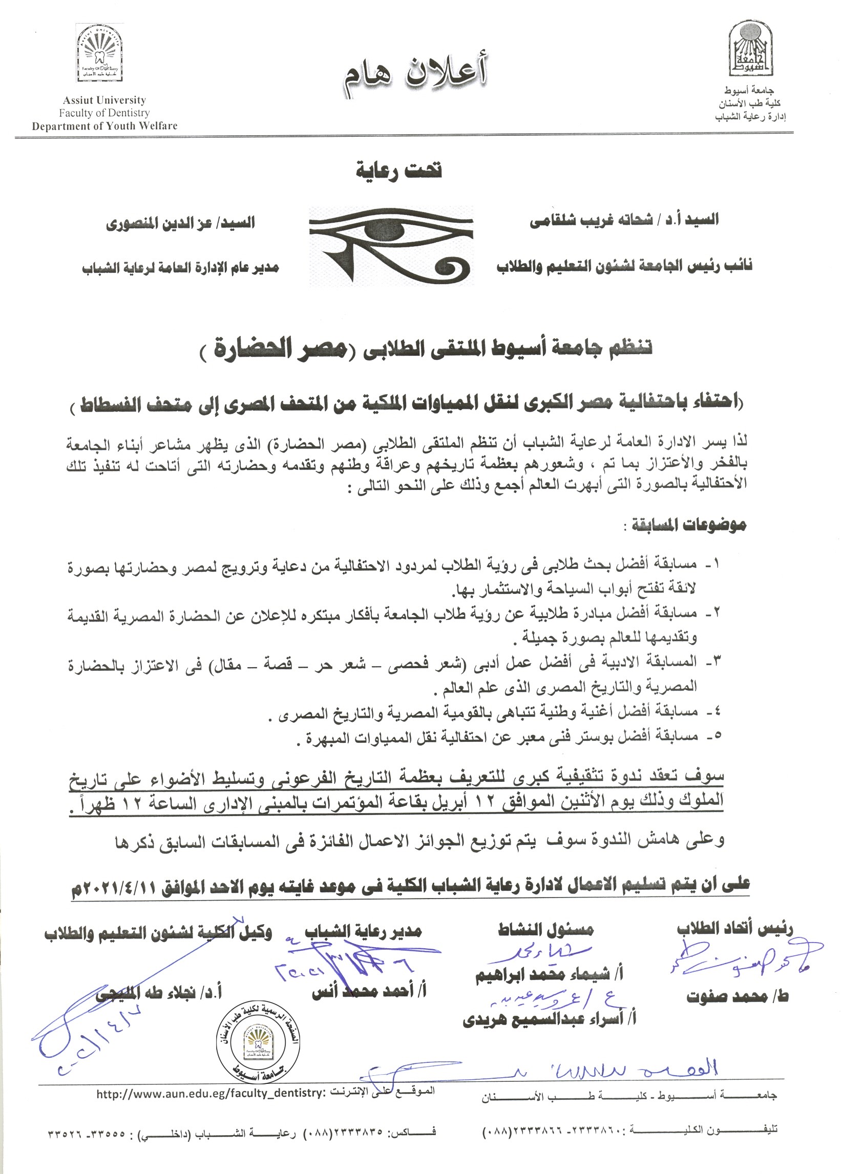تحت رعاية السيدأ.د/شحاته غريب شلقامي نائب رئيس الجامعة لشئون التعليم والطلاب ،السيد/عز الدين المنصوري مدير عام الأدارة العامة لرعاية الشباب ،تنظم جامعة أسيوط الملتقى الطلابي(مصر الحضارة) ،(احتفاء باحتفالية مصر الكبرى لنقل الممياوات الملكية من المتحف المصر