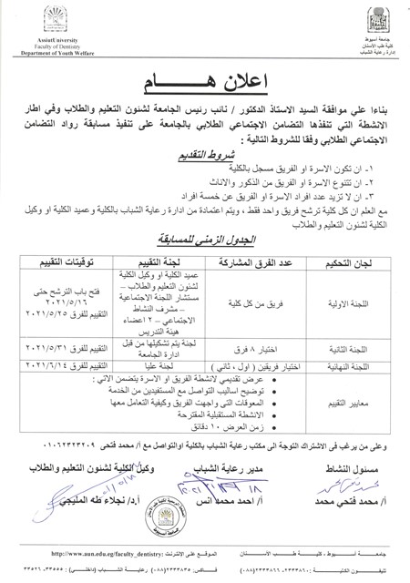 اعلان هام ،، في اطار الانشطه التى تنفذها التضامن الاجتماعي الطلابي بالجامعة على تنفيذ مسابقة رواد التضامن الاجتماعي الطلابي و فقا للشروط الواردة في الاعلان .