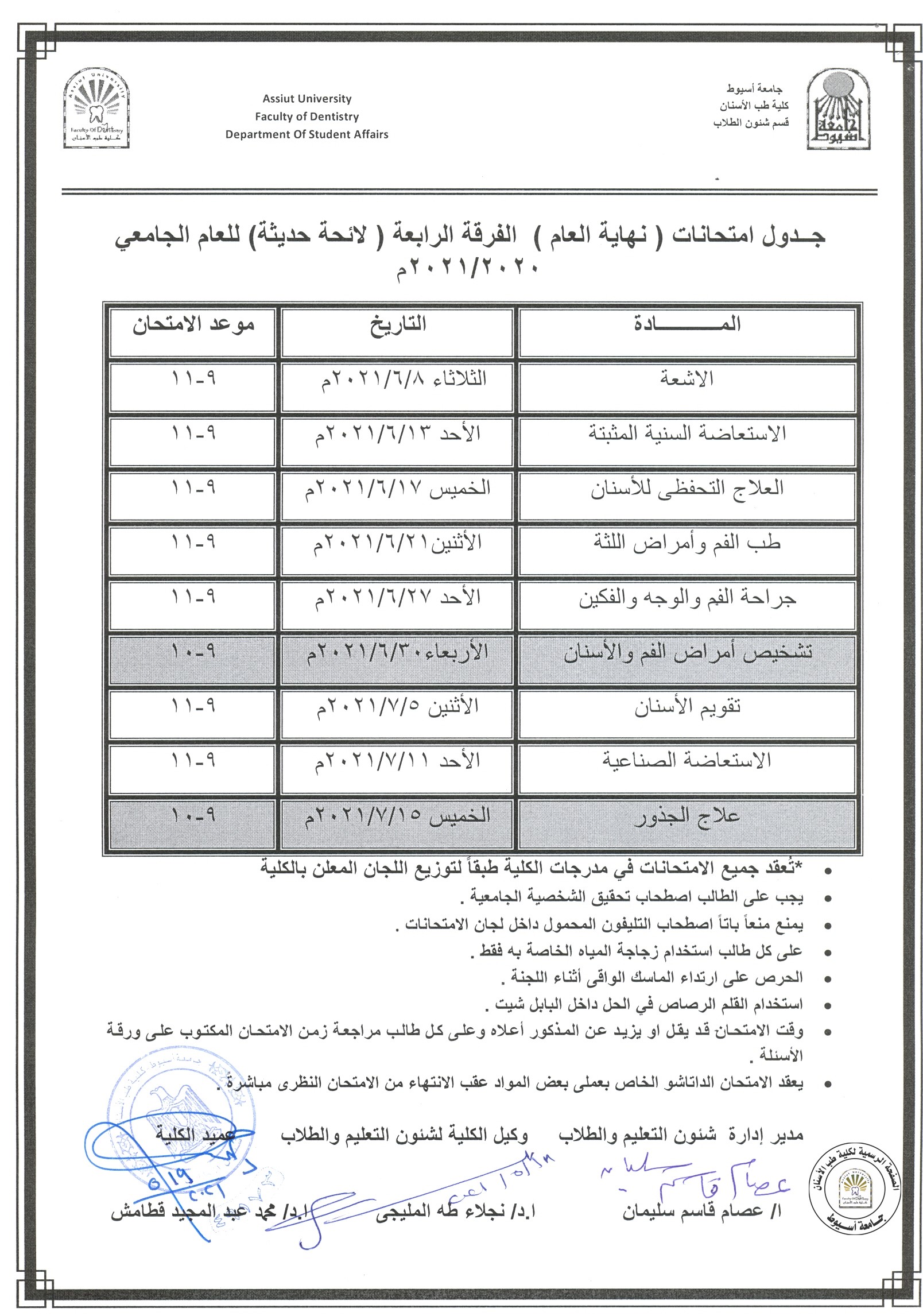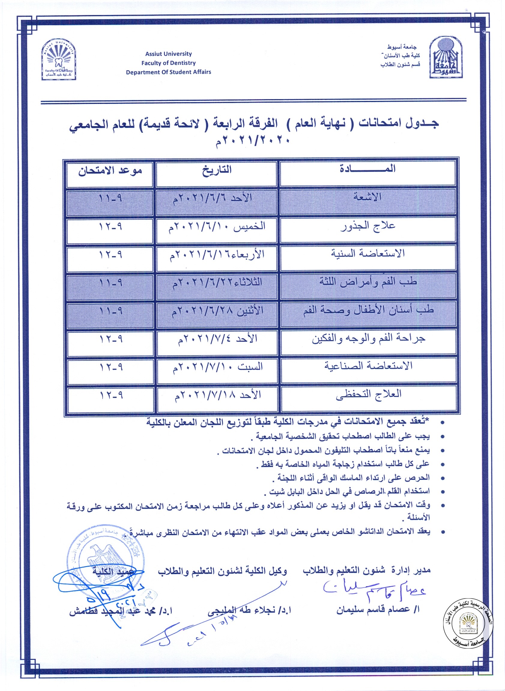 جدول امتحانات (نهاية العام )للفرقة الرابعة"لائحة قديمة " للعام الجامعي 2020/2021م .