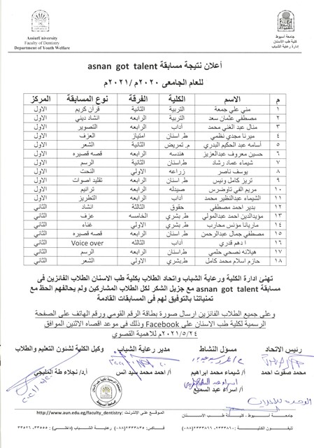 تهنئ ادارة الكلية ورعاية الشباب واتحاد الطلاب بكلية طب الاسنان الطلاب الفائزين في مسابقة asnan got talent مع جزيل الشكر لكل الطلاب المشاركين ولم يحالفهم الحظ مع تمنياتنا بالتوفيق لهم في المسابقات القادمة .