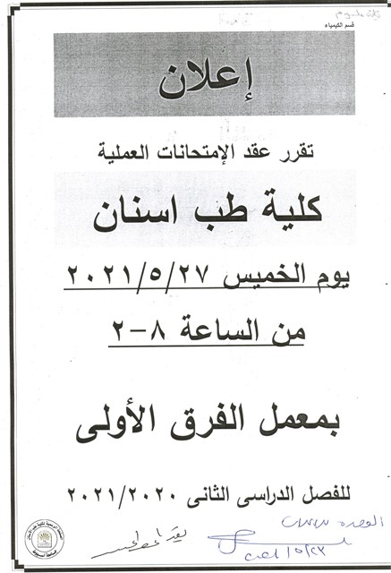 اعلان هام سوف يتم عقد امتحانات اعمال السنه للتخلفات فى مواد : علاج الجذور الاستعاضة الصناعية طب الاطفال فى يوم الامتحان النظرى بعد نهاية الامتحان و بمعرفة القسم.