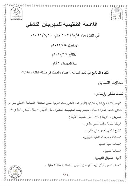 اعلان عن اللائحة التنظيمية للمهرجان الكشفي في الفترة من 5/8/2021 حتى11/8/2021،وعلى الطلبة الراغبين الاشتراك التوجه لإدارة رعاية الشباب بالكلية للتسجيل أو التواصل مع مسئول النشاط أ/محمد يحي 01019707274 .