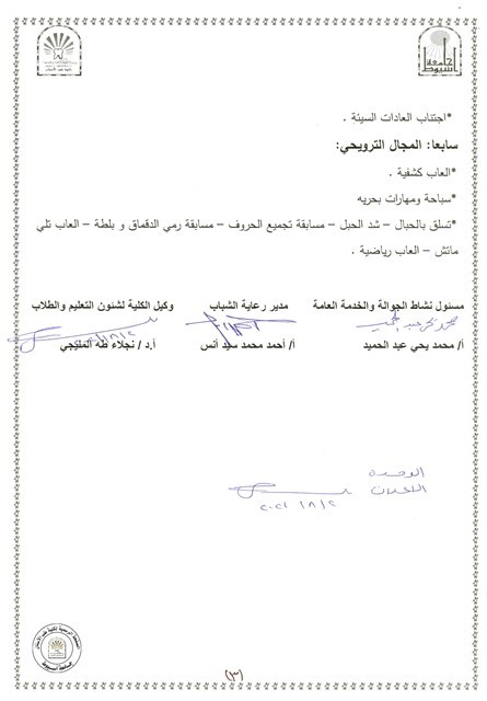 • برامج ترفيهية رياضية وثقافية وفنية خلال فترة المعسكر.