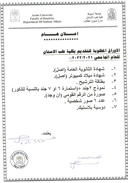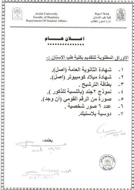 الاوراق المطلوبة للتقديم بكلية طب الاسنان .