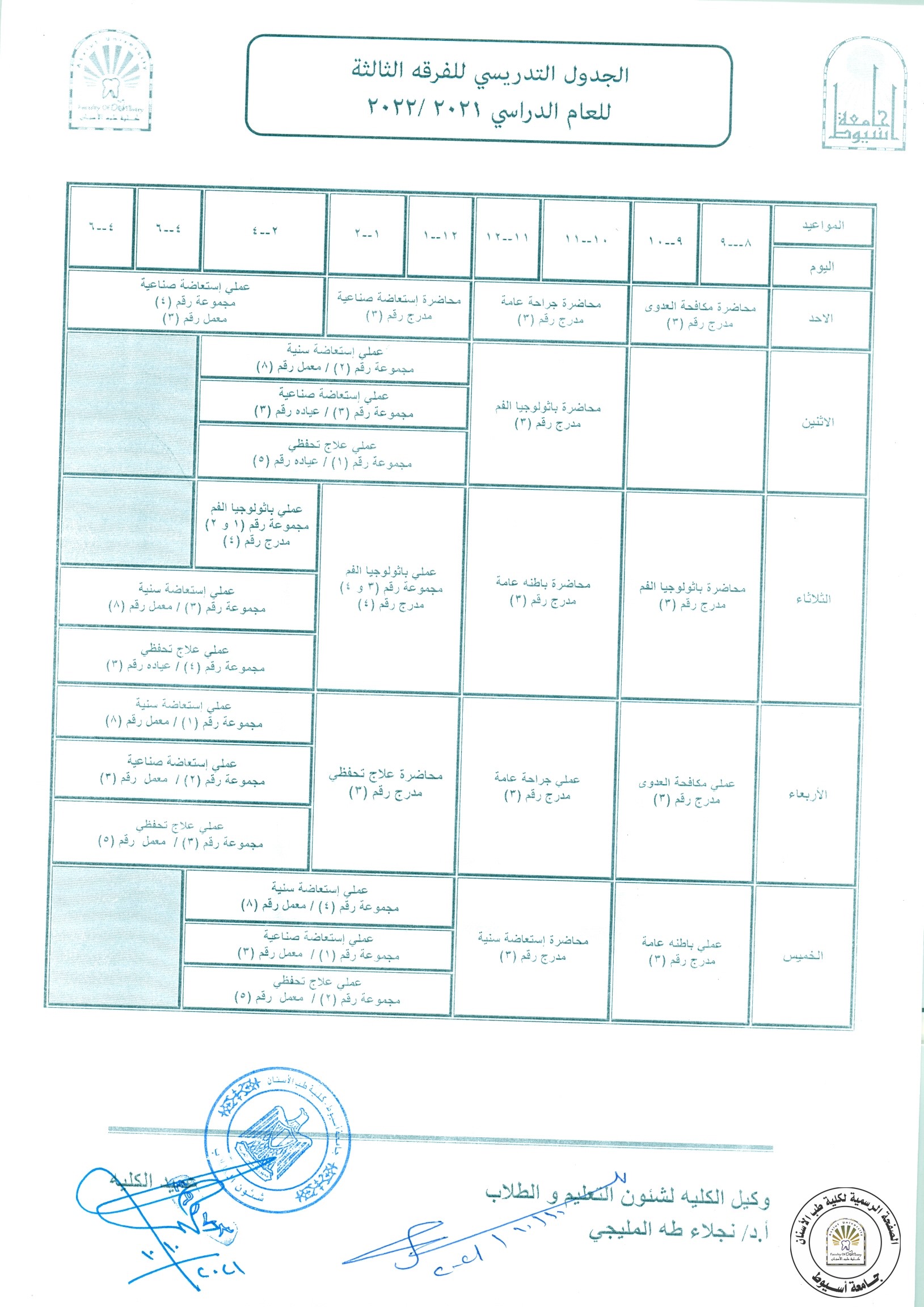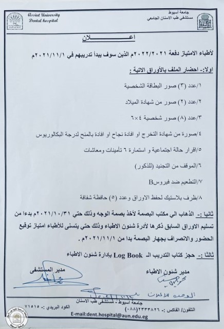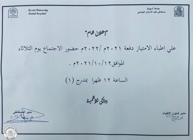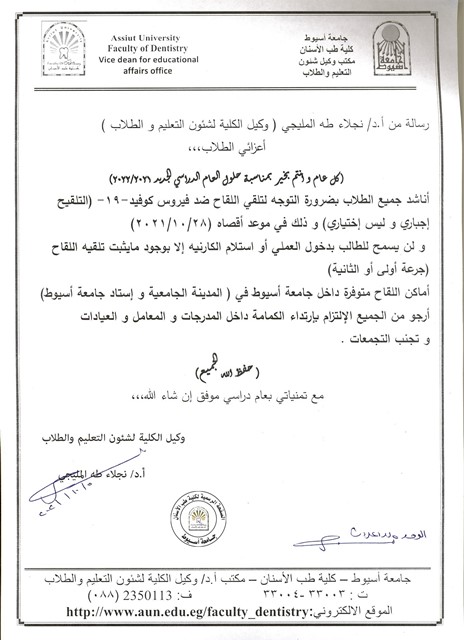 اعلان هام لجميع طلاب الفرق. بناءاًعلى التعليمات ، فقد تقرر انه اعتباراً من يوم الأحد 17/10/2021 لن يسمح للطلاب بدخول العملي ، إلا من تلقى لقاح كوفيد-١٩ و معه ما يثبت ذلك سواء الجرعة اولى او الجرعة ثانية.
