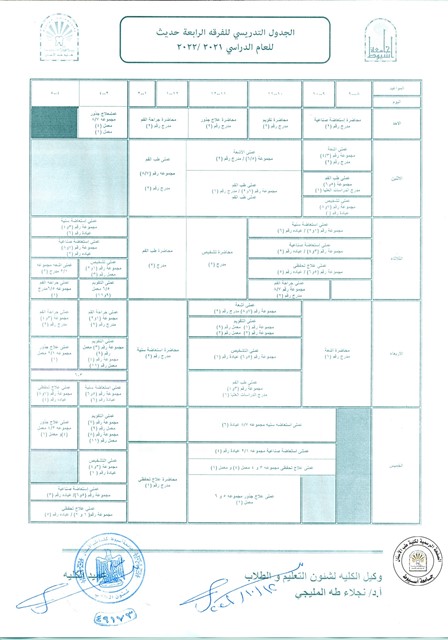 ( تصحيح ) .. الجدول التدريسي للفرقة الرابعة حديث للعام الدراسي 2021/2022 م.