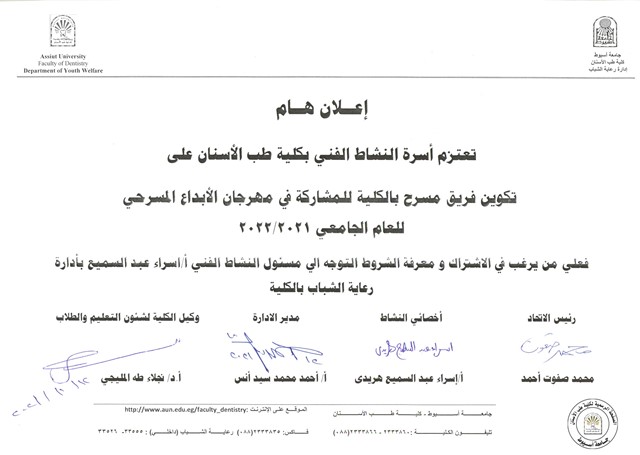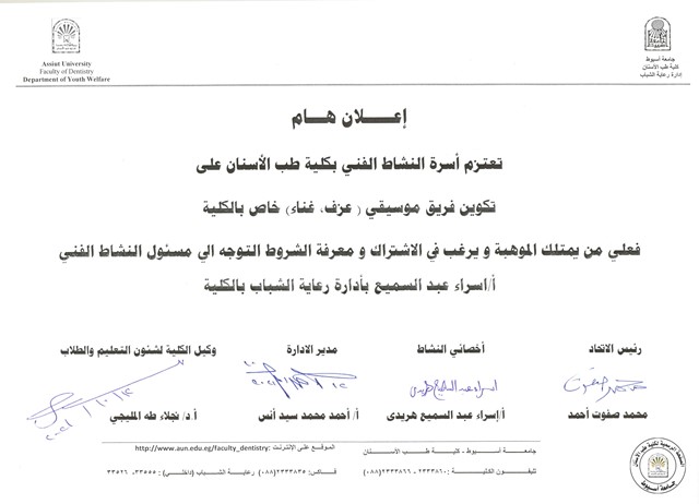 يعتزم النشاط الفني بكلية طب الأسنان على تكوين فريق موسيقي (عزف،غناء) خاص بالكلية .
