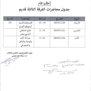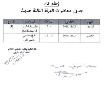 على الطلاب المذكوره أسمائهم بــ ( الفرقة الثالثة حديث ) التوجه إلى مكتب سكرتارية وكيل الكلية لشئون التعليم و الطلاب ، يوم الأحد الموافق 24/11/2019
