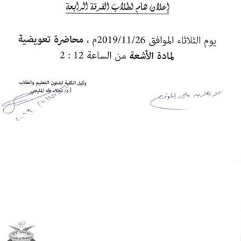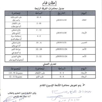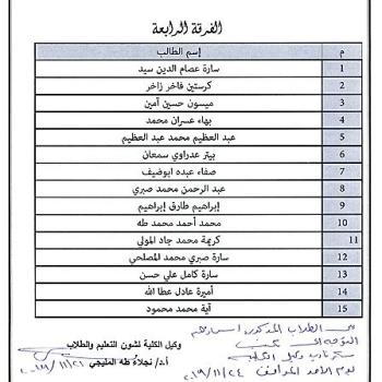 على الطلاب المذكوره أسمائهم بــ ( الفرقة الرابعة ) التوجه إلى مكتب سكرتارية وكيل الكلية لشئون التعليم و الطلاب ، يوم الأحد الموافق 24/11/2019…