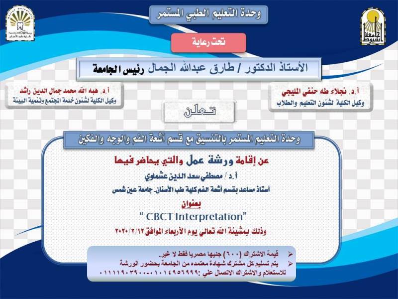 تعلن وحدة التعليم الطبي المستمر بالكلية بالتنسيق مع قسم أشعة الفم و الوجه والفكين عن إقامه ورشة عمل بعنوان " CBCT Interpretation "