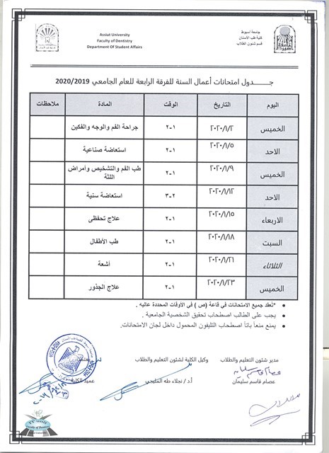 جداول امتحانات أعمال السنة (الفرقة الرابعة). 8 ديسمبر 2019 جداول امتحانات أعمال السنة (الفرقة الرابعة).