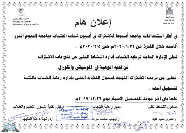 إعلان هام عن فتح باب الاشتراك لمن لديه الموهبة في الموسيقى والكورال . 3 ديسمبر 2019 إعلان هام عن فتح باب الاشتراك لمن لديه الموهبة في الموسيقى والكورال .