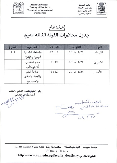 إعلان هام جدول (محاضرات الفرقة الثالثة قديم) . 17 نوفمبر 2019 إعلان هام جدول (محاضرات الفرقة الثالثة قديم) .