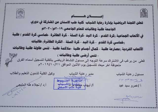 إعلان هام عن المشاركة في دوري الجامعة طلبة وطالبات للعام الجامعي 2019 /2020