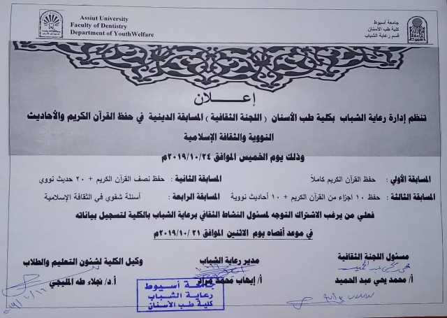 إعلان عن المسابقة الدينية في حفظ القرآن الكريم والاحاديث النبوية والثقافة الإسلامية