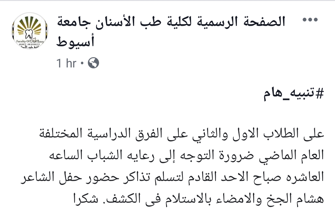تنبيه هام 10 أكتوبر 2019 علي الطلاب الاول والثاني علي الفرق المختلفة التوجه لرعاية الشباب بالكلية لتسلم تذاكر حفلة الشاعر هشام الجخ ،، الاحد القادم ١٠ صباحا والتوقيع بالاستلام ،وشكرا