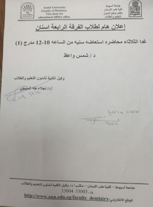 اعلان هام لطلاب الفرقة الرابعة اسنان 30 سبتمبر 2019 https://www.facebook.com/Assuitaun/posts/pfbid02kHE2dRy23kT26QuVzMSYBQEdSUxcxAa8Km1X6uJWhd6MGWCH7EaxzWX4zivkxXEal