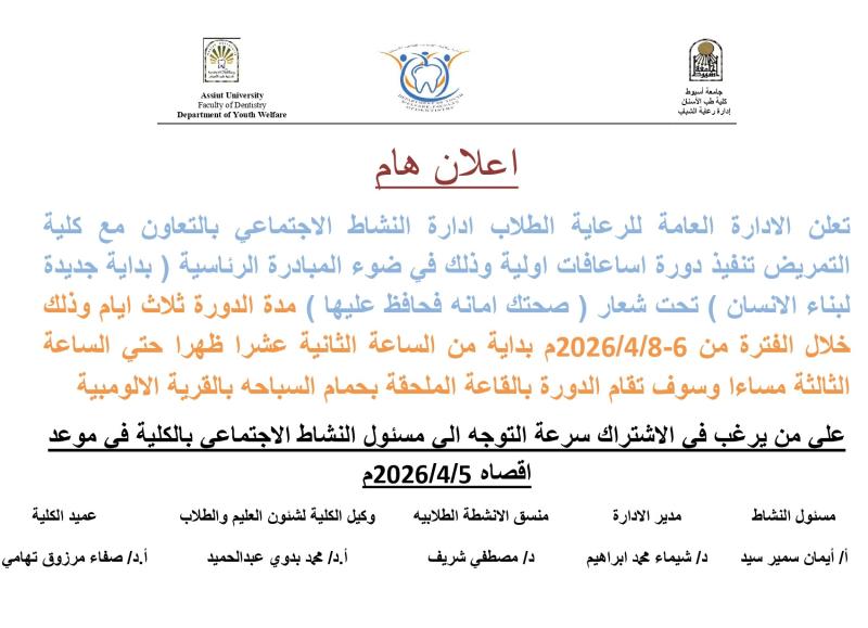 اعلان عن تنفيذ دورة الاسعافات الاولية وذلك في ضوء المبادرة الرئاسية ( بداية جديدة لبناء الانسان ). 1 أبريل 2026