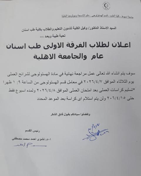 اعلان هام لطلاب الفرقة الأولى (عام - أهلية )