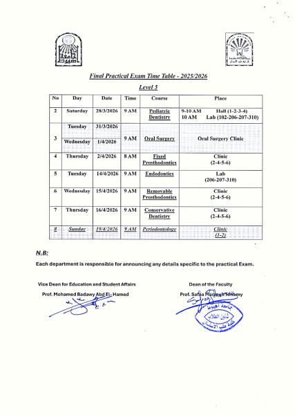 جدول مواعيد الامتحانات العملية النهائية - 2025/2026 للفرقة الخامسة .