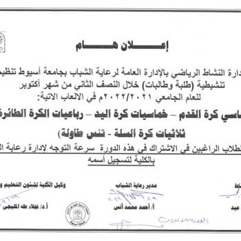 The Department of Sports Activity for Youth Welfare at Assiut University intends to organize a refresher course for male and female students during the second half of October for the academic year…