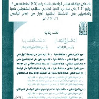 Granting the Student Excellence Shield for students who excel scientifically and excel in student activities based on the approval of the University Council, starting from the academic year 2021/2022.
