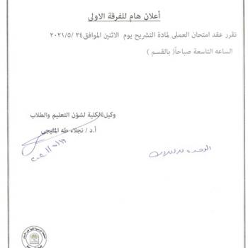 Important announcement, for the First year students, determining the Practical exam for General Anatomy.