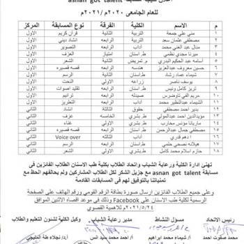 The College Administration, Youth Welfare and Student Union at the College of Dentistry congratulate the winners of the asnan got talent competition with many thanks to all the participating students…