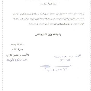 determined in the following subjects: General Physiology: Wednesday, 5/19/2021 Descriptive Anatomy: Thursday, 5/20/2021 *NOTE : 1- The department is responsible for announcing any examination details…