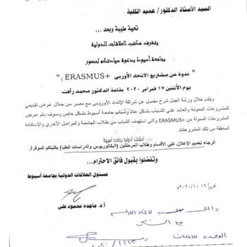 The Office of International Relations at the University of Assiut has the honor to invite you to attend a "Symposium on European Union Projects + ERASMUS" on Monday 17 February 2020 in Dr. Mohamed…