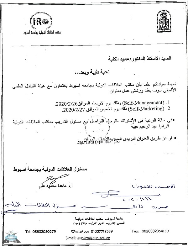 The International Relations Office at Assiut University announces two workshops 4 February 2020 1-(Self-Management ) Wednesday 26/2/2020 2- ( Self-Marketing) Thursday 27/2/2020 aun-iro@aun.edu.eg