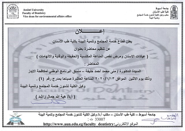The Community Service and Environmental Development Sector announces the organization of a lecture entitled (Dental Clinics and HIV).