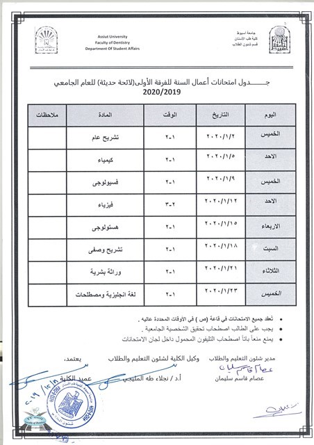 Exams Timetable for 1st year