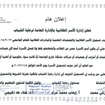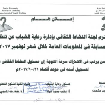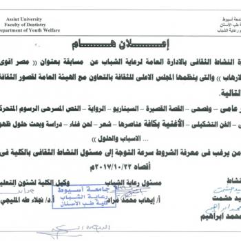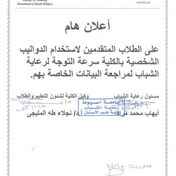 على جميع المراحل لطلاب جامعة أسيوط؛ سيتم عقد دورة التربية العسكرية رقم (19) فى المدة من 28 / 9 / 2024 إلى 11 / 10 / 2024، وعلى جميع…