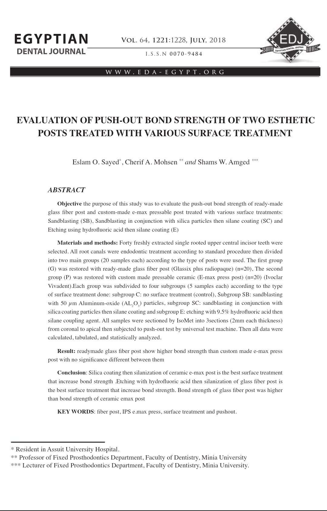 Conclusion: Silica coating then silanization of ceramic e-max post is the best surface treatment that increase bond strength .Etching with hydrofluoric acid then silanization of glass fiber post is the best surface treatment that increase bond strength. Bond strength of glass fiber post was higher than bond strength of ceramic emax post