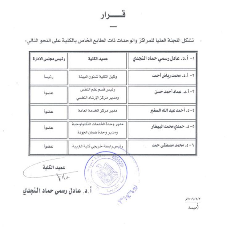 تم تشكيل اللجنة العليا للمراكز والوحدات ذات الطابع الخاص بكلية التربية على النحو التالى :