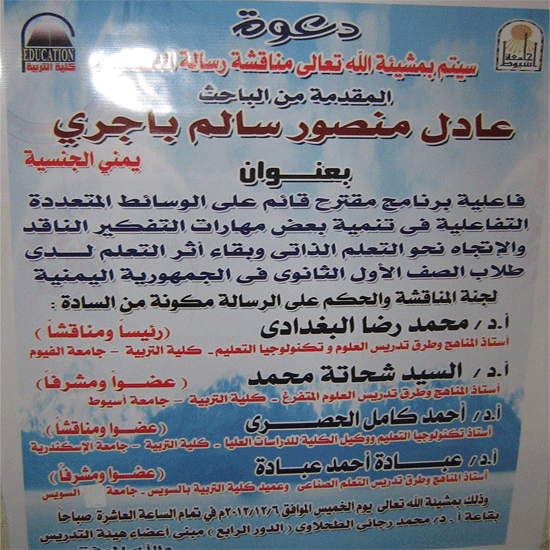مناقشة رسالة الدكتوراة المقدمة من الباحث / عادل منصور سالم باجري يمني الجنسية - كلية التربية 4 ديسمبر 2012 مناقشة رسالة الدكتوراة المقدمة من الباحث / عادل منصور سالم باجري يمني الجنسية - كلية التربية
