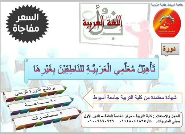ولأول مرة في جامعة اسيوط تم تحديد موعد كورس إعداد معلمي اللغة العربية للناطقين بغيرها وذلك بدءا من يوم ١٨/٢/٢٠١٨ والحجز مفتوح من الان