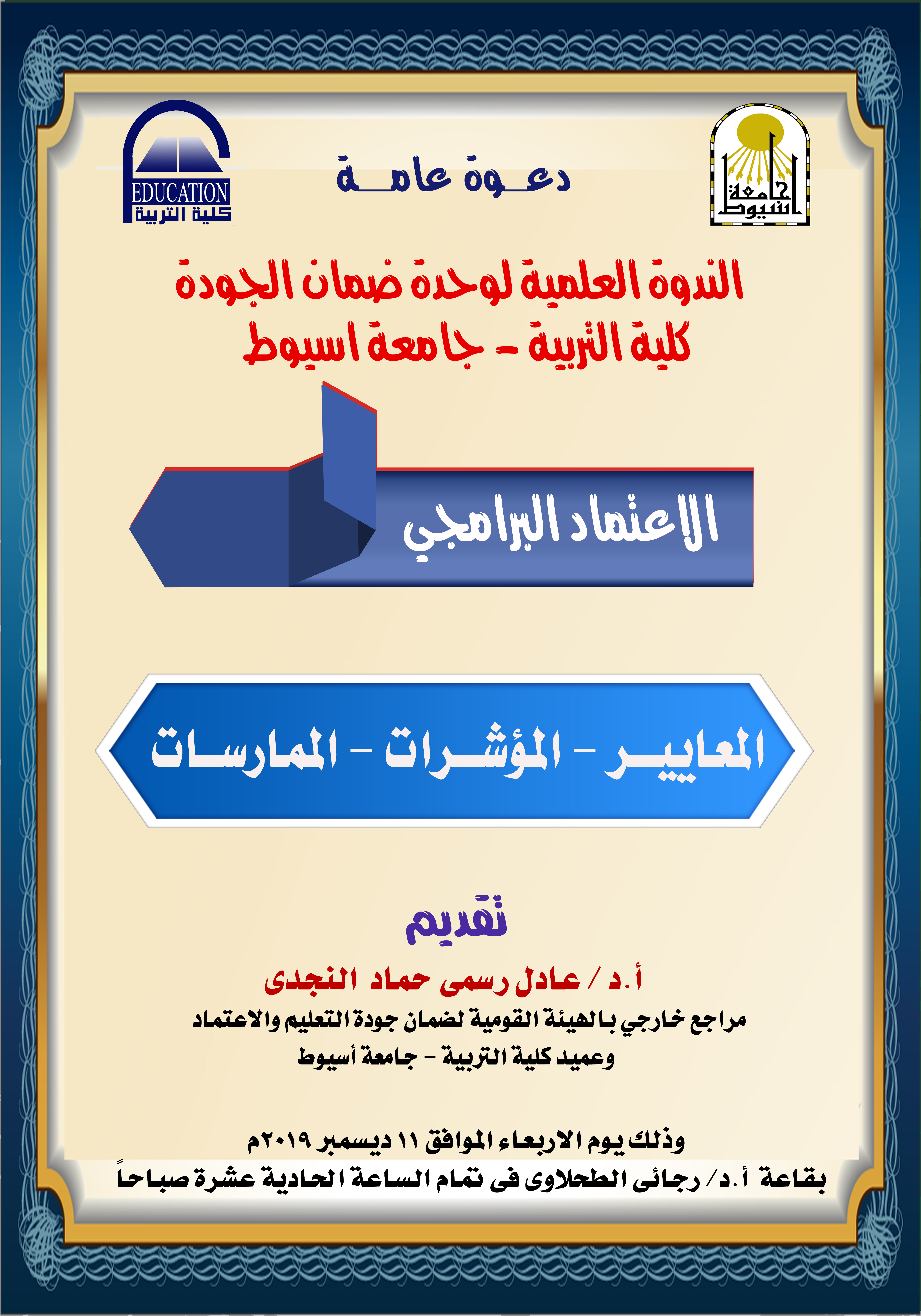 جاء ذلك خلال ندوة علمية تعريفية نظمتها وحدة ضمان الجودة بكلية التربية عن الإعتماد البرامجي للمعايير و المؤشرات و الممارسات وذلك بحضور الاستاذ الدكتور عادل رسمي حماد عميد كلية التربية والمراجع الخارجي بالهيئة القومية لضمان الجودة و الاستاذ الدكتور حمدي محمد البيطار مدير وحدة ضمان الجودة و لفيف من أعضاء هيئة التدريس من مختلف الأقسام بالكلية.