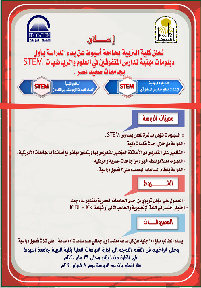 كلية التربية بجامعة أسيوط تعلن عن بدء الدراسة بأول دبلومات مهنية لمدارس المتفوقين في العلوم والرياضيات STEM