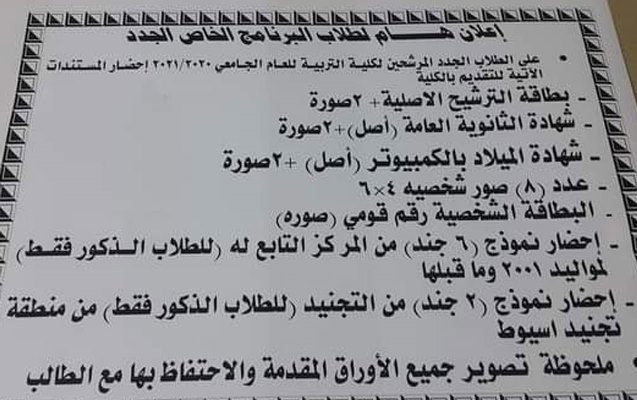 استكمال فعاليات معسكر استقبال الطلاب الجدد الاسبوع الثالث اليوم الثالث من مبادرة "اعرف كليتك" التي اطلقها اتحاد الطلاب لخريجي الثانوية العامة للالتحاق بكلية التربية وتقديم اوراقهم ومساعدتهم وتسهيل الامور عليهم وتوضيحها من متطلبات التقديم وملئ استمارات التقديم للالتحاق بالكلية وتعريفهم باقسام الكلية المختلفة وما تحتويه من مناهج دراسية ومحتوي علمي ويستمر معسكر الاستقبال لمساعده الطلاب في شتي الامور المختلفة بالكلية