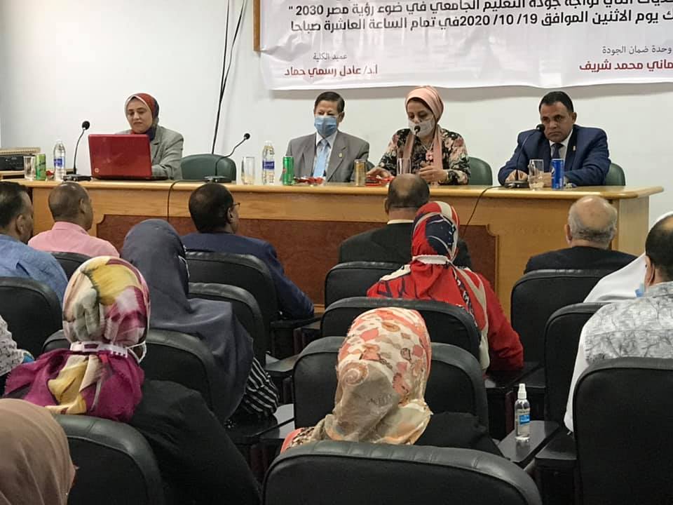أقامت وحدة ضمان الجوده بالكلية تحت رعاية الدكتور/ عادل النجدي عميد الكليه ندوه عن التحديات التي تواجه التعليم الجامعي في ضوء رؤية مصر ٢٠٣٠بحضور الدكتوره /مها كامل غانم نائب رئيس الجامعة لشئون البيئة وتنمية المجتمع وعدد من اساتذة الكلية والوكلاء ورؤساء الاقسام ومسئولي وحدات الجودة بكليات التربية للطفولة المبكره والتربية النوعية والزراعة والصيدلة والهندسة وبحوث السكر والفنون الجميلة.